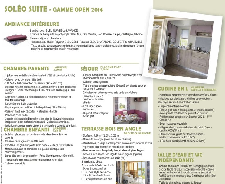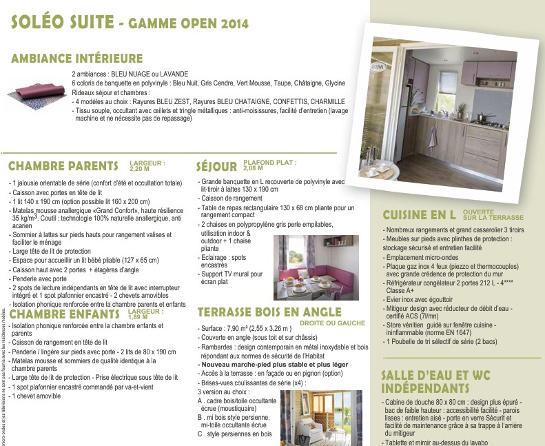 Mobil‑home IRM Soléo – 2014, offre un espace intérieur généreux grâce à ses 9,15 m de longueur et 4,50 m de largeur. Il dispose d’une terrasse intégrée en bois de 7,90 m², idéale pour profiter pleinement des beaux jours.