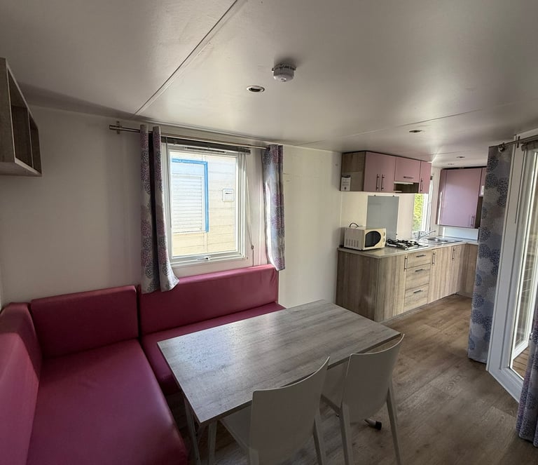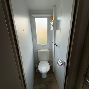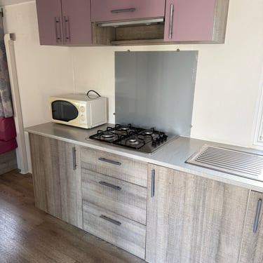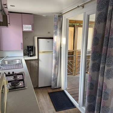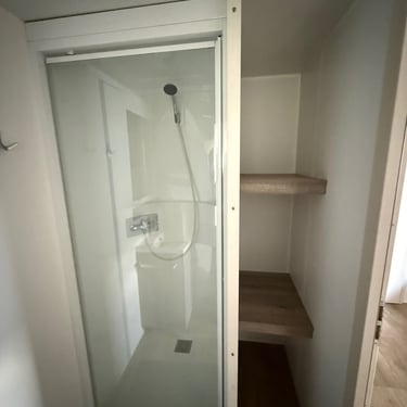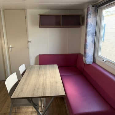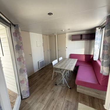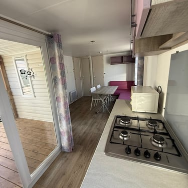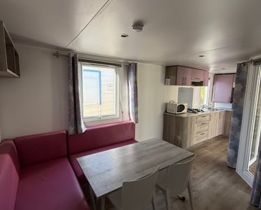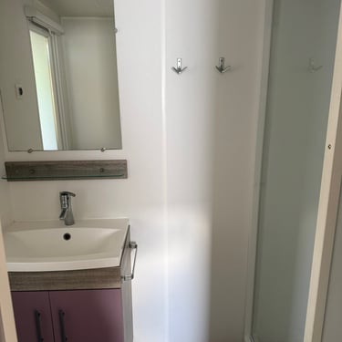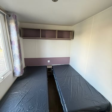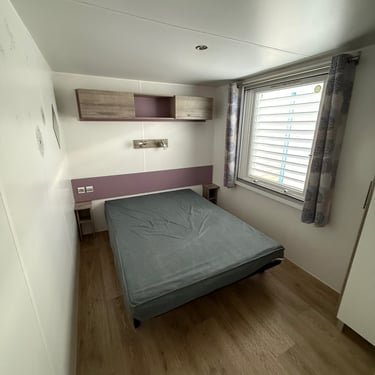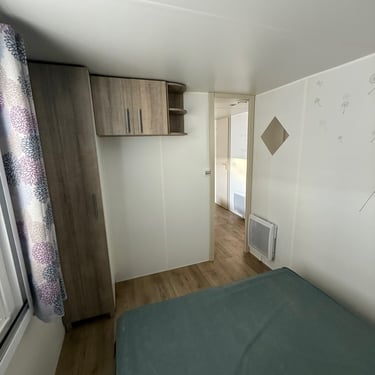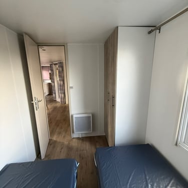 Le mobil‑home comprend deux chambres : une chambre parentale et une chambre enfant avec 2 lits simples, offrant une capacité d’accueil optimale. La salle d’eau est fonctionnelle et les WC sont séparés pour plus de confort.