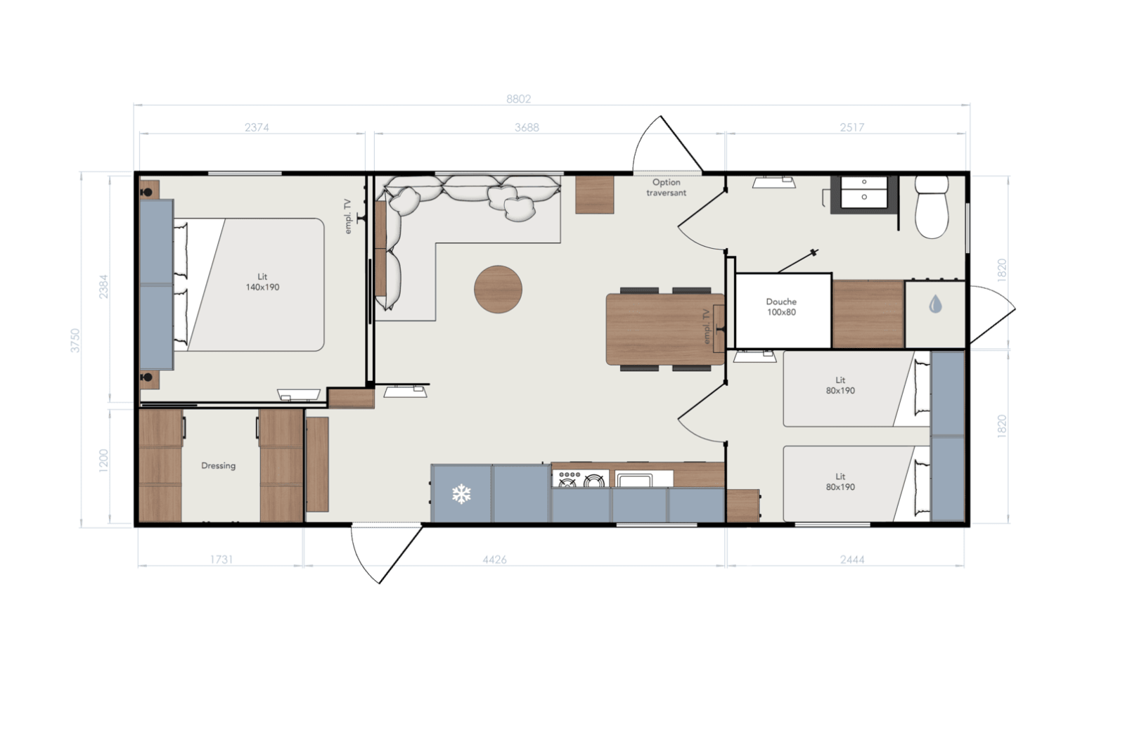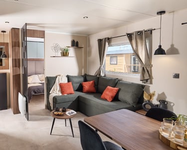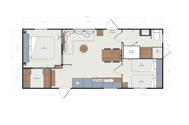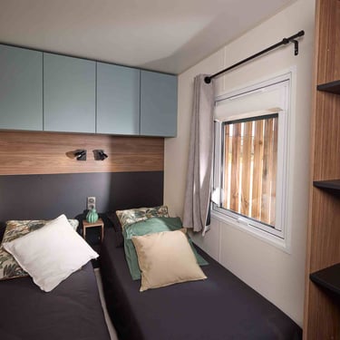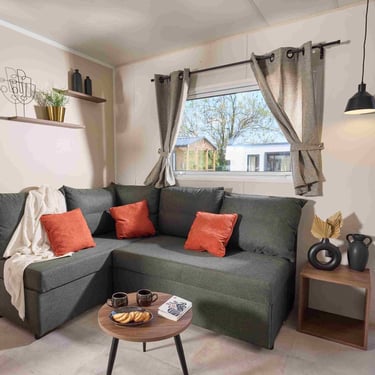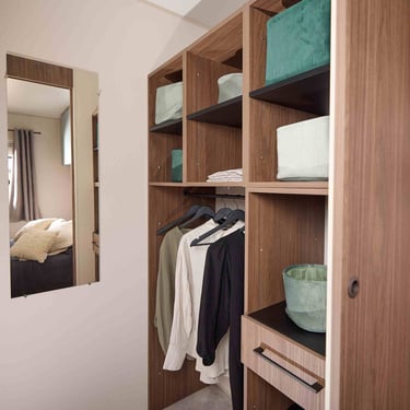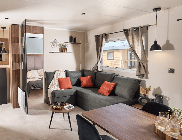 Le mobil home ELYA 35.2 vous offre un espace de vie ergonomique ! Son espace salon, avec son grand canapé d'angle, vous invite à la détente. Son hall d'entrée vous permet de ranger vos affaires dès votre retour de balade et ses pièces de vie vous offrent de nombreux rangements. La chambre parentale de l'ELYA 35.2 est équipée d'un véritable dressing pour vous installer comme à la maison !